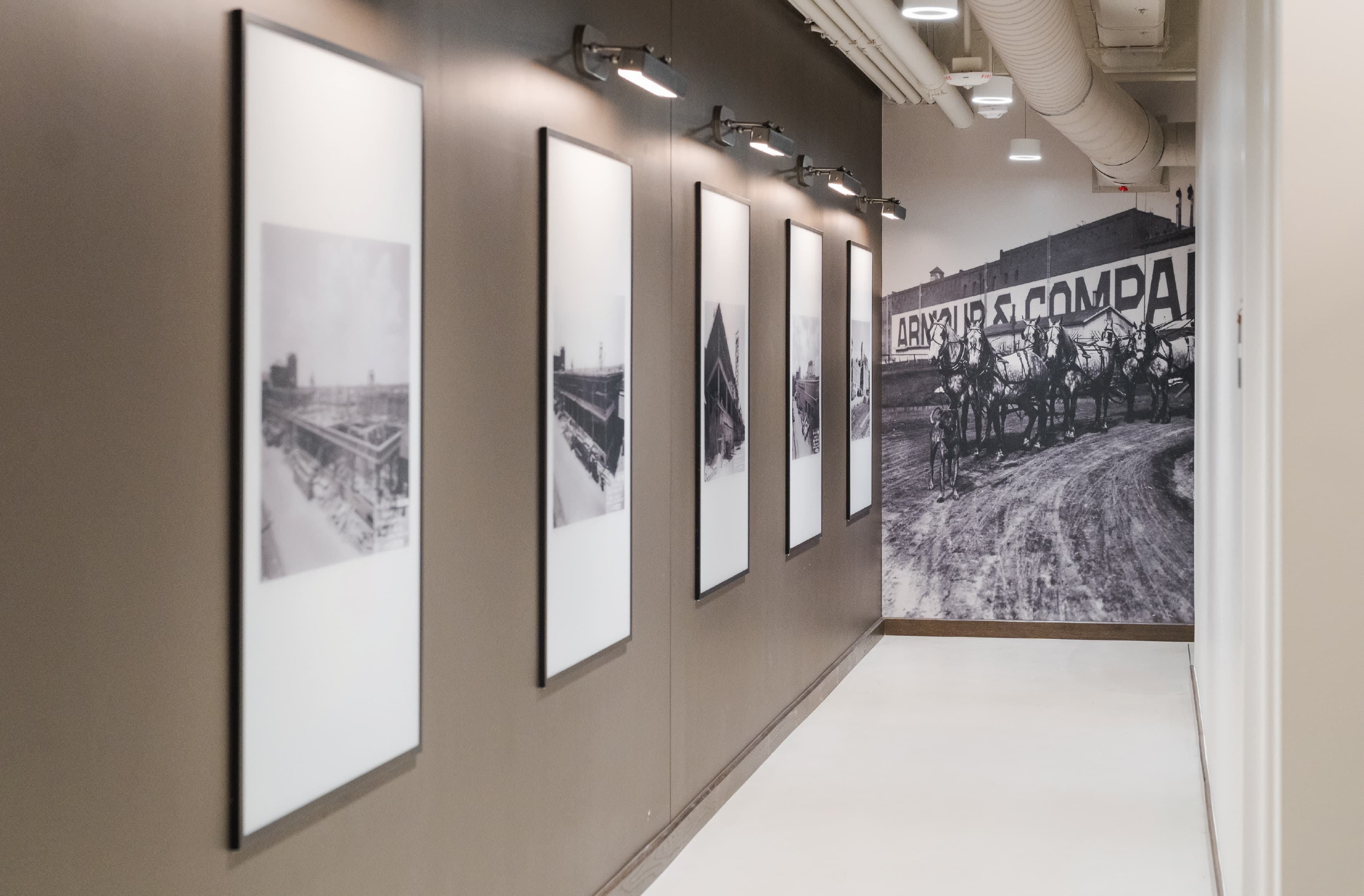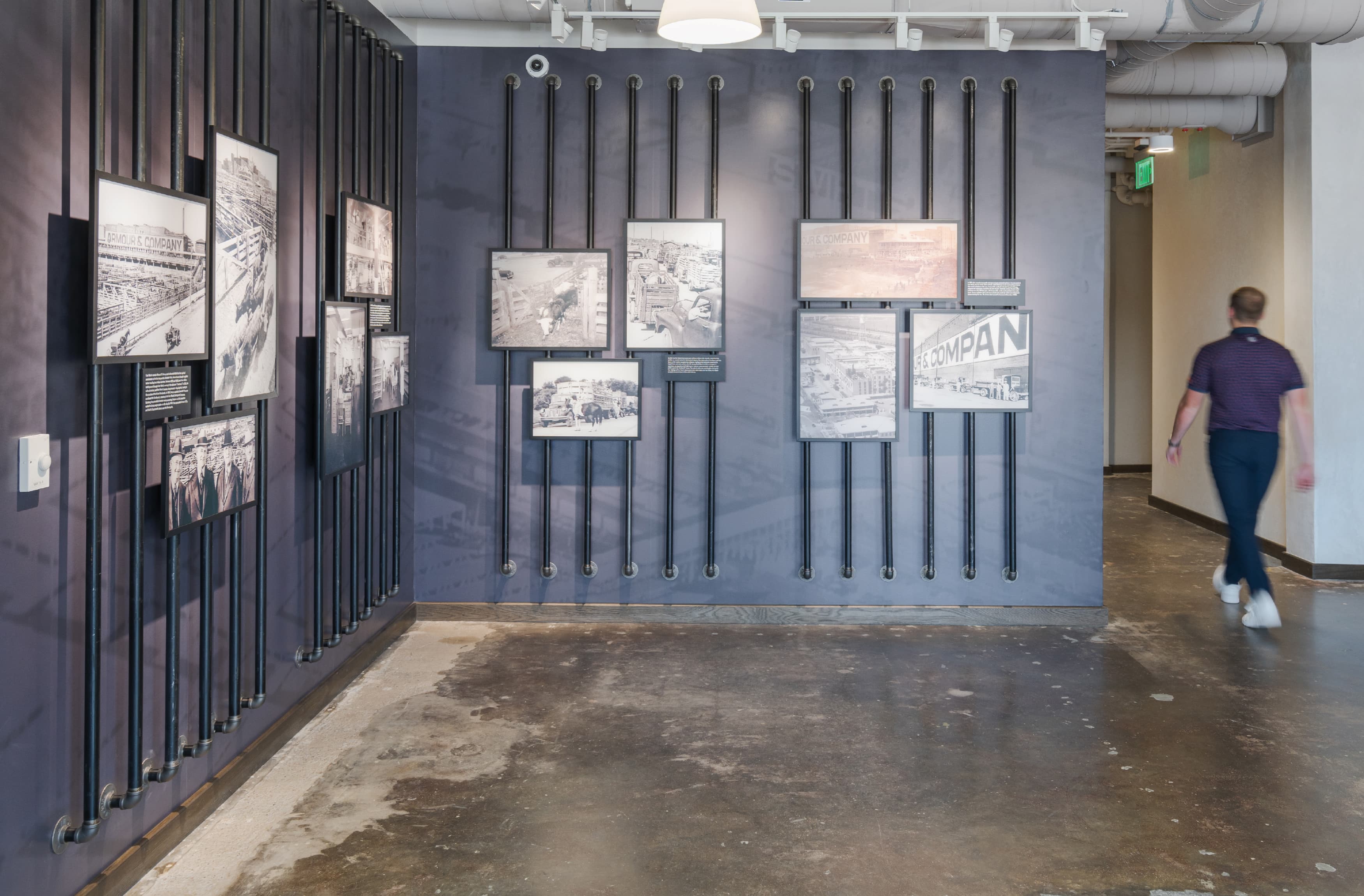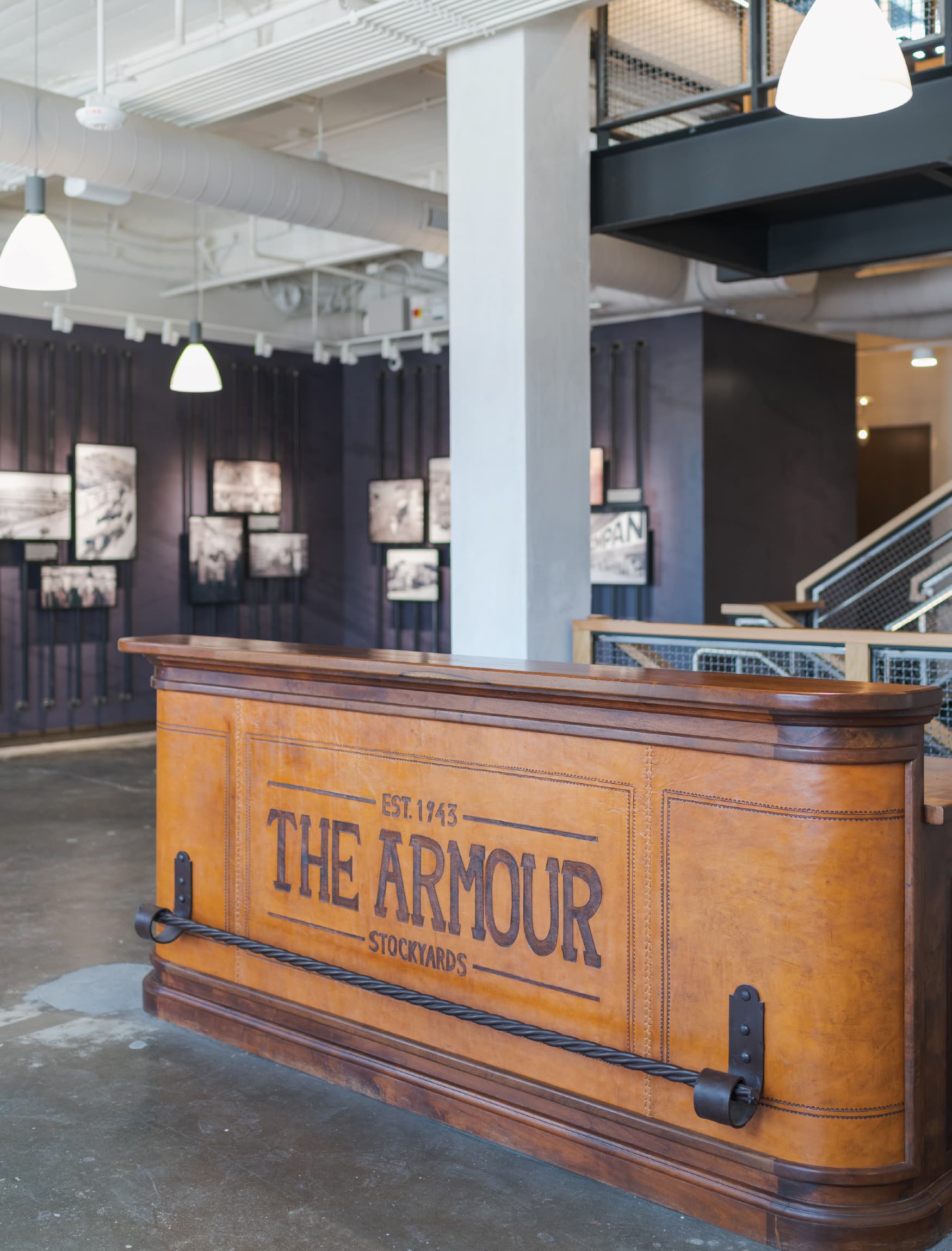 Inside the Armour Building, RSM Design infused the interiors with branded graphic elements that celebrated both history and place. A large-scale timeline wall was created to narrate the story of the building’s evolution, while painted graphics were thoughtfully applied to the existing aged walls and exposed brick, blending new layers of design with the raw character of the architecture. Working closely with the client, the team curated and displayed archived historical photographs that captured the Armour in its heyday, ensuring that the legacy of Fort Worth’s industrial past remained visible and honored within its contemporary reimagining.