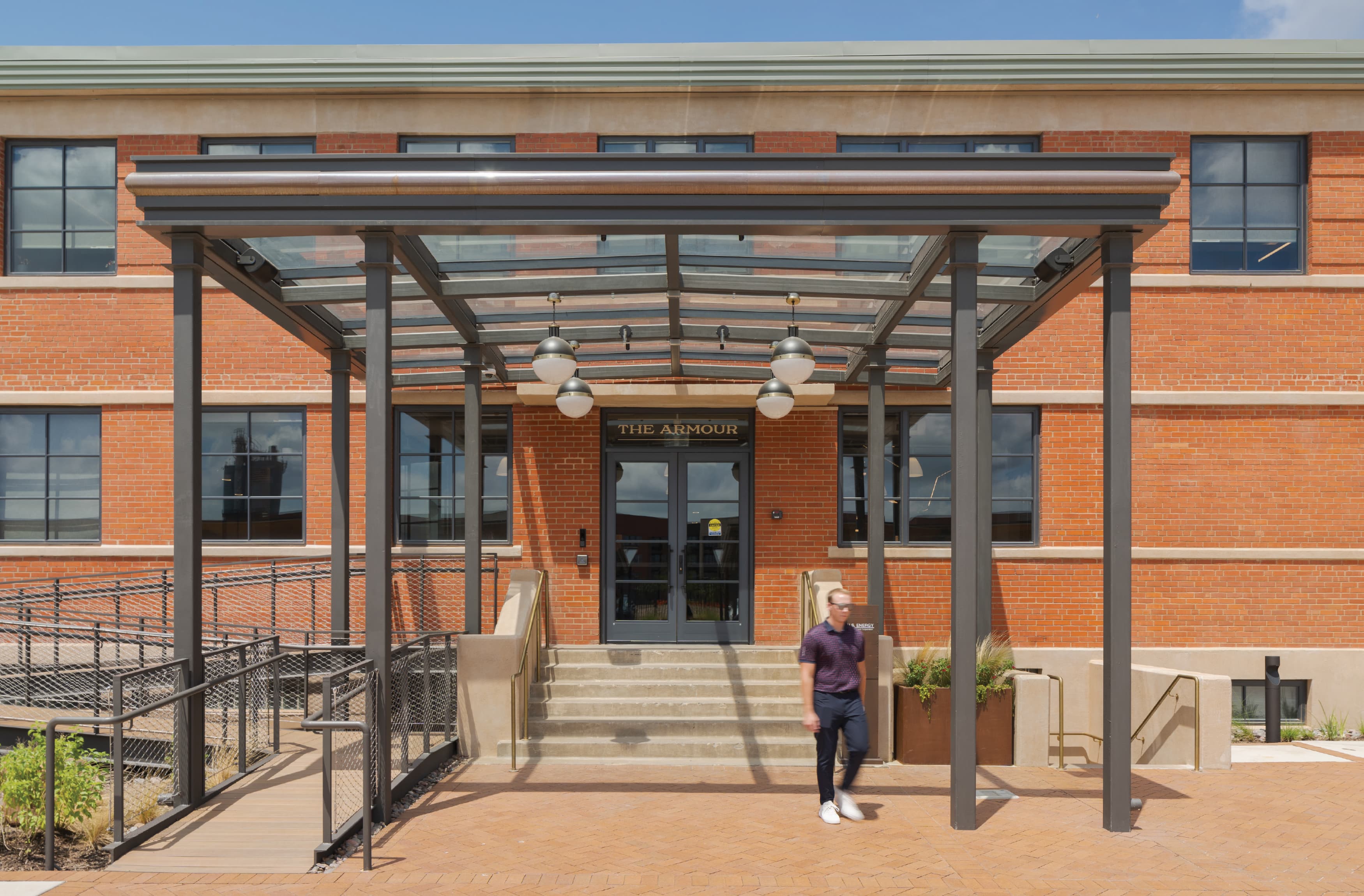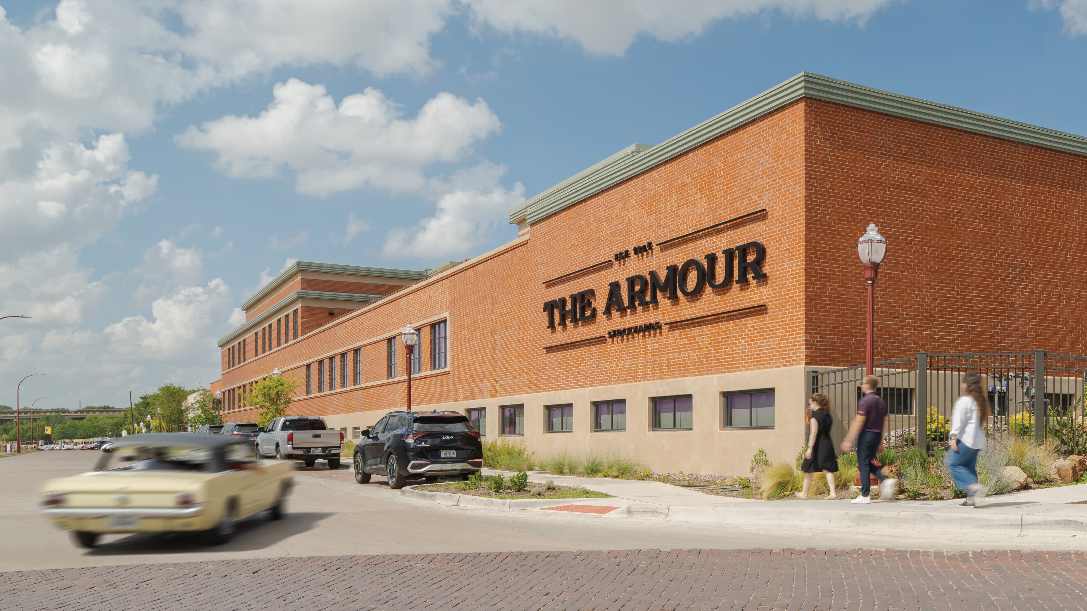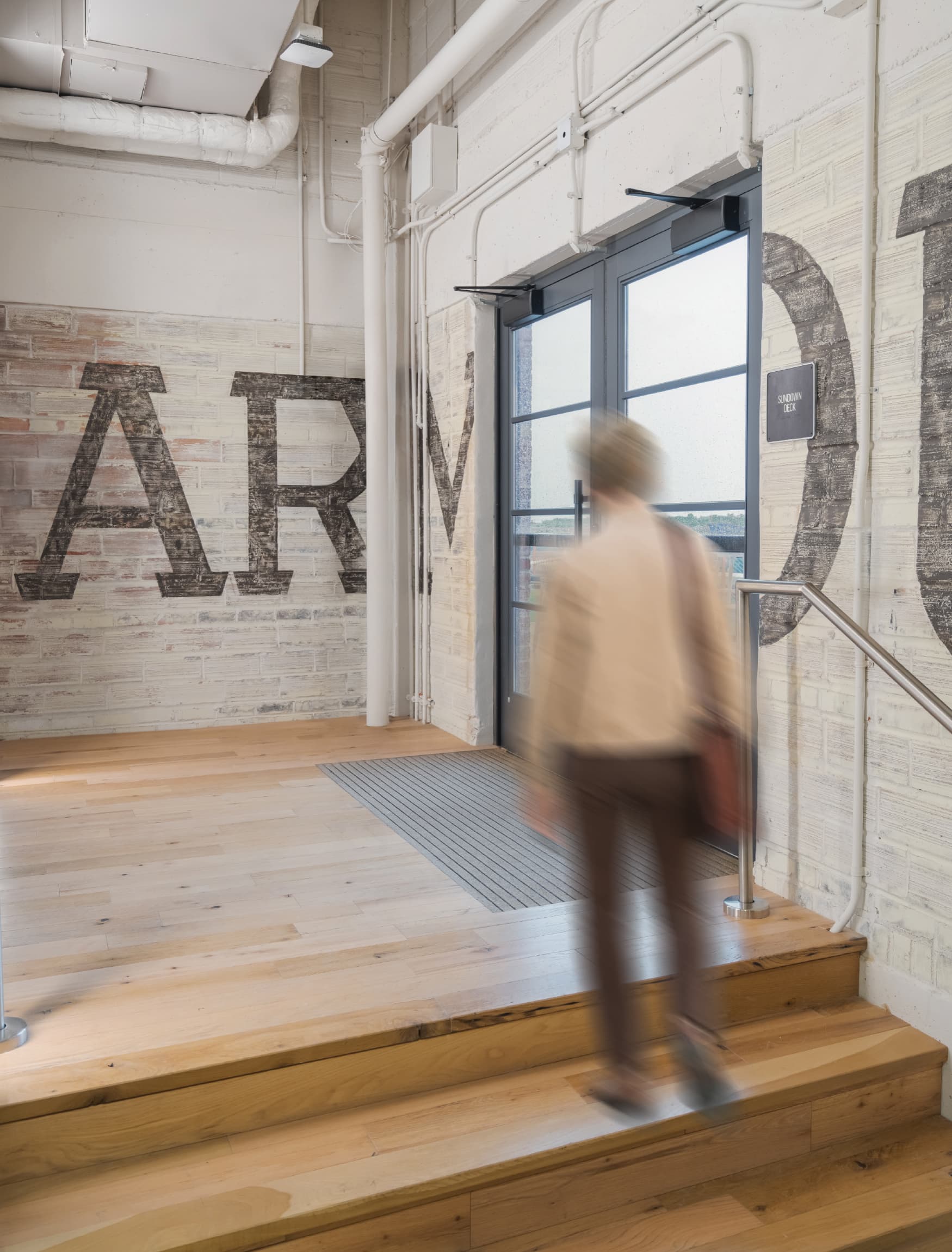Inside the Armour Building, RSM Design infused the interiors with branded graphic elements that celebrated both history and place. A large-scale timeline wall was created to narrate the story of the building’s evolution, while painted graphics were thoughtfully applied to the existing aged walls and exposed brick, blending new layers of design with the raw character of the architecture. Working closely with the client, the team curated and displayed archived historical photographs that captured the Armour in its heyday, ensuring that the legacy of Fort Worth’s industrial past remained visible and honored within its contemporary reimagining.
