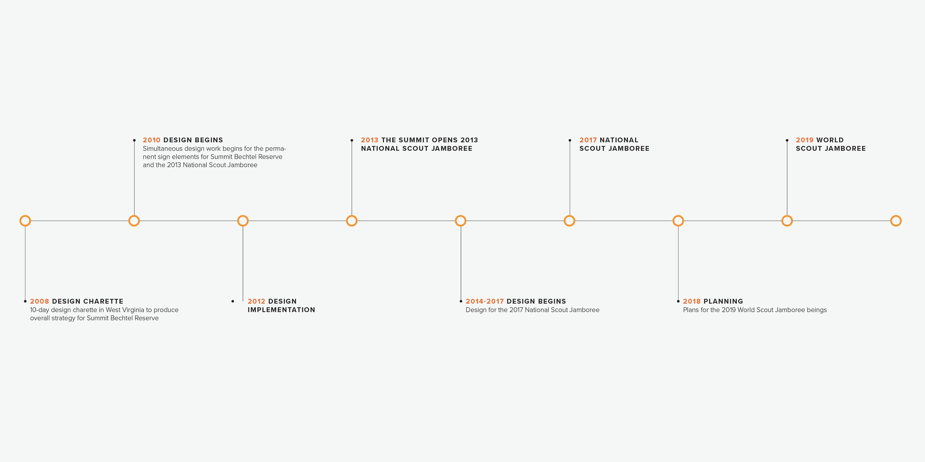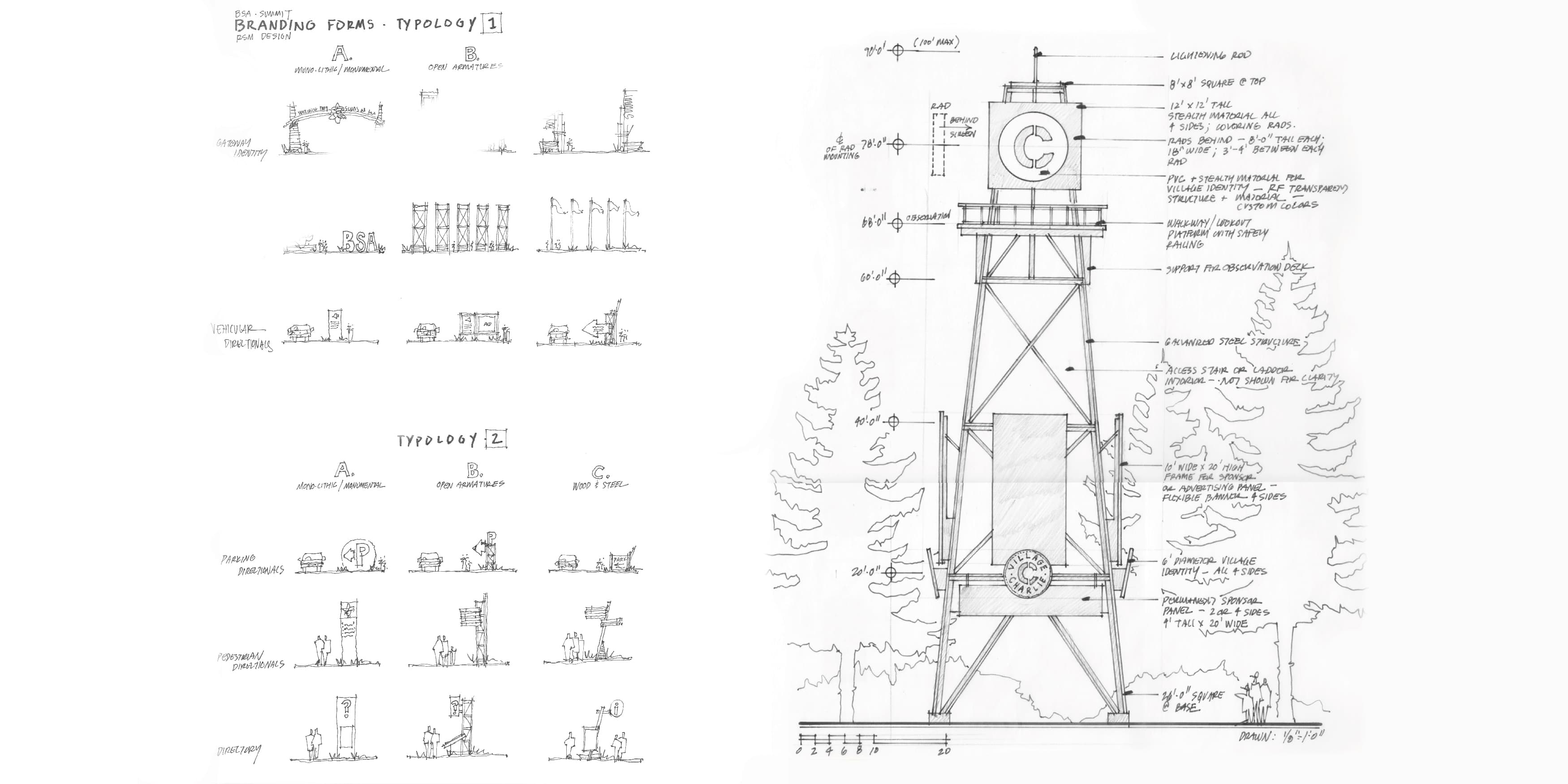 RSM Design developed a long-term relationship with the Boy Scouts of America to develop the permanent and temporary branding, placemaking and wayfinding for the Summit and the National Scout Jamboree events. Our involvement in the planning of this site began with the strategies defined in the Source Book in 2008, laying the groundwork for the design principles that would guide future decisions and development.
